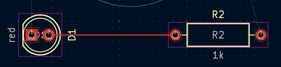 오른쪽 도구 모음에서 트랙 경로를 클릭 하거나 X 를 누릅니다. D1 패드의 led를 클릭하고 래츠네스트 선은 R2 패드의 led 에 라우팅되지 않은 연결이 있음을 나타내므로, 해당 패드를 클릭하여 두 패드를 연결하는 트랙을 그립니다. 두 번째 패드를 클릭하면 트랙이 완성됩니다. 핀 사이의 래츠네스트 선은 구리로 연결되었으므로 더 이상 그려지지 않습니다.