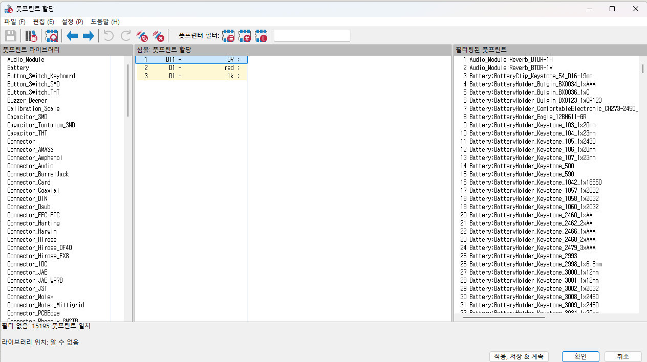 풋프린트 할당 창의 왼쪽에는 사용 가능한 풋프린트 라이브러리가 나열됩니다. 가운데 창에는 회로도의 심볼이 표시됩니다. 모든 심볼에는 풋프린트가 할당됩니다. 오른쪽 창에는 가운데 창에서 선택한 심볼에 대해 선택할 수 있는 풋프린트가 표시됩니다.