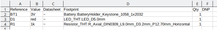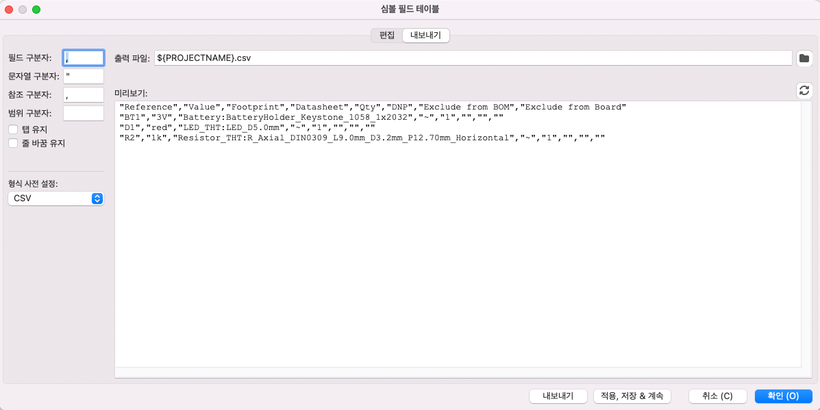 KiCad에는 BOM 내보내기용 GUI가 있습니다. '편집' 탭 에서 내보낼 심볼 메타데이터와 심볼 그룹화 방식을 설정하고 , '내보내기' 탭 에서 출력 형식을 설정할 수 있습니다. 지금은 기본 설정 그대로 사용해도 괜찮지만, 미리보기 창에서 내보낼 원본 파일을 확인할 수 있습니다. '내보내기' 탭에서 출력 파일을 지정한 후 '내보내기' 버튼을 누르세요.