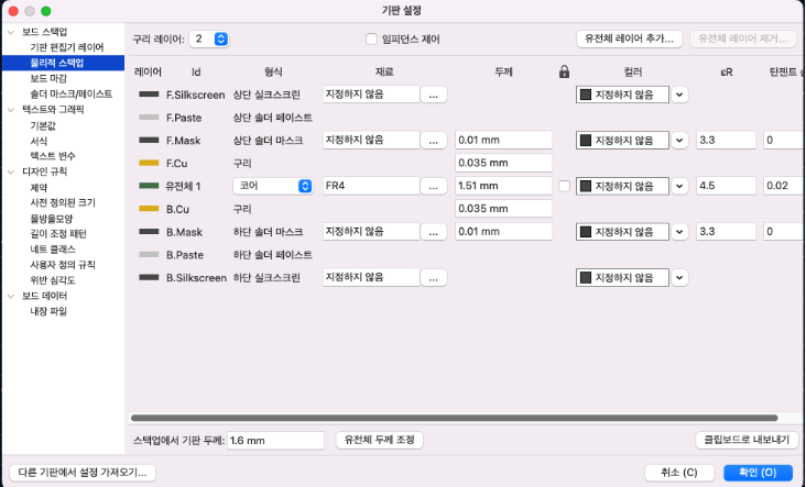 스택업을 설정하려면 보드 설정 창의 "보드 스택업 → 물리적 스택업" 페이지를 엽니다. 이 가이드에서는 구리 층 수를 2개로 두지만, 더 복잡한 프로젝트에서는 더 많은 층이 필요할 수 있습니다.