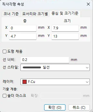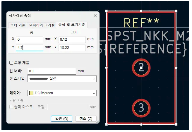 다음으로 F.Silkscreen 레이러로 전환합니다. 실크스크린 윤곽선이 부품 윤곽선 바로 바깥쪽에 오도록 하려면, 실크스크린 선은 제작 레이어의 선보다 0.11mm 바깥쪽으로 그려야 합니다 (참고로, 0.11mm는 제작 선 너비 0.10mm의 절반에 실크스크린 선 너비 0.12mm의 절반을 더한 값입니다).
