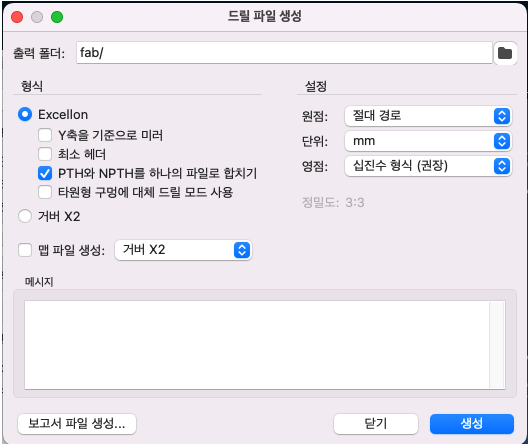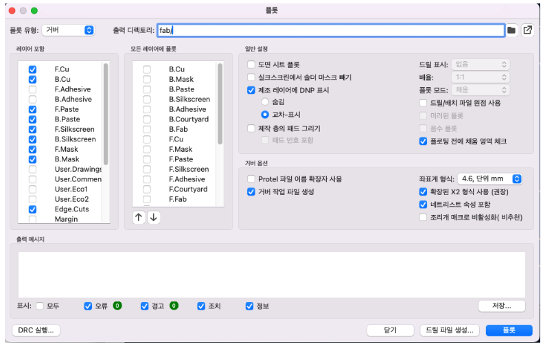 플롯된 파일이 폴더에 저장될 수 있도록 출력 디렉터리를 지정하세요. 필요한 모든 레이어가 선택되었는지 확인하세요. 구리 레이어(*.Cu), 보드 아웃라인(Edge.Cuts), 솔더 마스크(*.Mask), 실크스크린(*.Silkscreen)이 포함됩니다. 페이스트 레이어(*.Paste)는 솔더 페이스 스텐실 제작에 유용합니다. 접착 레이어(*.Adhesive)는 조립 과정에서 부품을 보드에 접착할 경우에만 필요합니다. 다른 레이어도 플롯에 유용할 수 있지만, 일반적으로 PCB 제작에는 필요하지 않습니다.