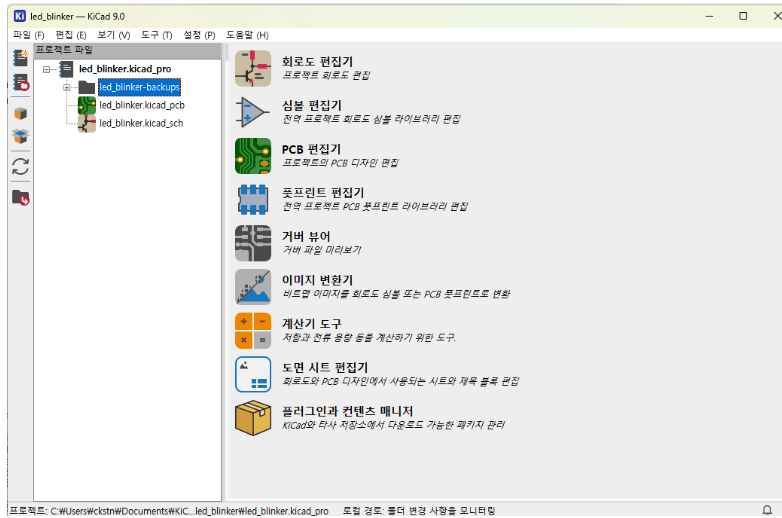 아, 프로젝트 이름을 LED_Blinker 라고 하면, LED_Blinker 라는 폴더가 생성되고 그 안에 .kicad_pcb, .kicad_sch 파일이 생성되는군요.