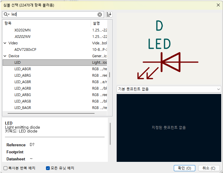 심볼 선택 대화 상자에는 사용 가능한 심볼 라이브러리와 그 안에 포함된 부품 심볼이 나열됩니다. 수동 부품, 다이오드 및 기타 일반 심볼과 같은 기본 장치는 Device 라이브러리에서 찾을 수 있습니다. 특정 LED와 같은 특정 장치는 다른 라이브러리에서 찾을 수 있습니다.