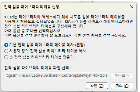 회로도 편집기를 처음 열면 전역 심볼 라이브러리 테이블을 구성하는 방법을 묻는 대화 상자가 나타납니다. 심볼 라이브러리 테이블은 KiCad에 어떤 심볼 라이브러리를 사용할 것인지와 그것들이 어디에 있는지를 알려줍니다.