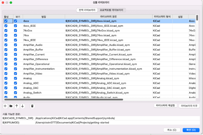 심볼과 풋프린트는 라이브러리로 정리됩니다. KiCad는 사용자의 심볼 라이브러리와 풋프린트 라이브러리를 각각 심볼 라이브러리 테이블과 풋프린트 라이브러리 테이블에 기록합니다. 운영체제 별로 위치는 다음과 같습니다.