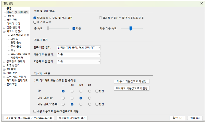 회로도를 이동하려면 마우스 가운데 버튼이나 오른쪽 버튼으로 클릭하고 드래그하면 됩니다. 마우스 휠이나 F1, F2로 확대/축소할 수 있습니다. 노트북 사용자는 터치패드에 맞게 마우스 제어 설정을 변경하면 편리하며, 이는 Preferences → Preferences… → Mouse and Touchpad에서 설정할 수 있습니다.