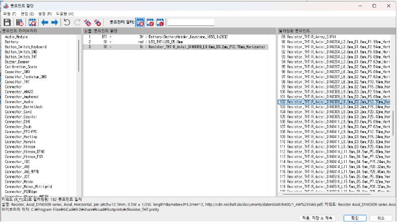 마지막으로, 각 부품에 풋프린트를 할당합니다. 이는 각 부품이 PCB에 어떻게 부착될지 정의합니다. 일부 심볼에는 풋프린트가 미리 할당되어 제공 됩니다. 부품에는 여러 개의 풋프린트가 있을 수 있으며 사용자는 적절한 풋프린트를 선택해야 합니다.