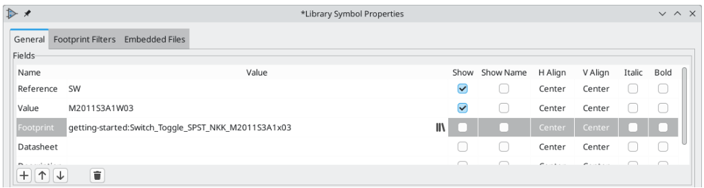 심볼 편집기로 돌아가서 스위치 심볼을 엽니다. 심볼 속성을 편집합니다. Footprint 필드를 클릭한 다음 나타나는 라이브러리 책 아이콘을 클릭합니다. 프로젝트 풋프린트 라이브러리로 이동하여 스위치 풋프린트를 두 번 클릭합니다. 심볼을 저장합니다.