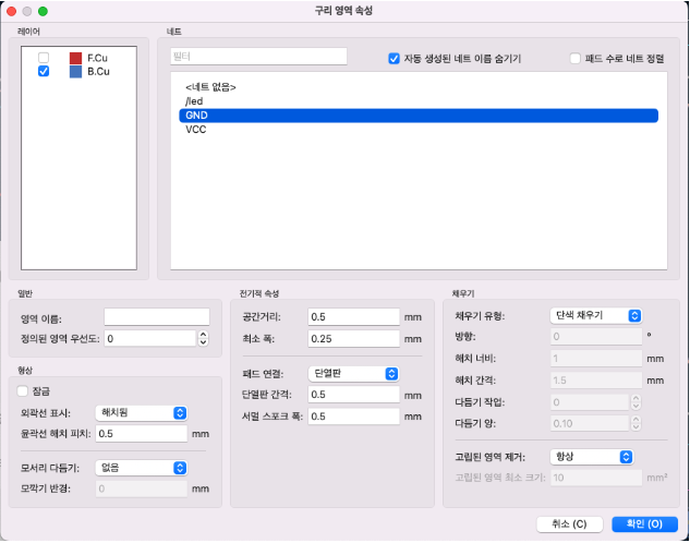 캔버스에 영역 윤곽선이 표시되지만, 영역은 아직 채워지지 않았습니다. 영역에 구리가 없으므로 전기 연결이 이루어지지 않습니다. "편집 → 모든 영역 채우기 (B)" 를 사용하여 영역을 채웁니다. 구리가 영역에 추가되었지만 LED, VCC 패드 또는 트랙은 연결되지 않고 가장자리에 잘립니다. 즉, 같은 네트(GND)의 패드만 자동으로 연결되고 다른 네트(VCC, LED 등)는 피해서 채워집니다.