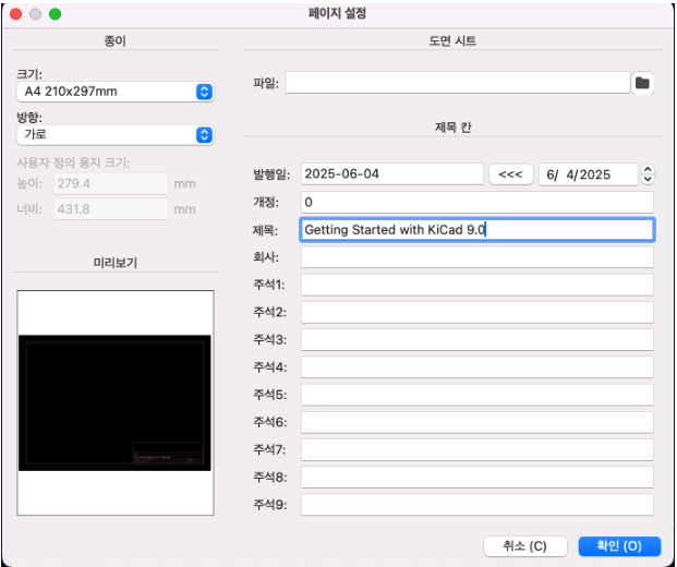 회로도를 그리기 전에 회로도 시트를 설정하세요. "File → Page Settings"을 클릭하세요. 회로도에 제목과 날짜를 지정하고, 원하는 경우 용지 크기를 변경하세요.