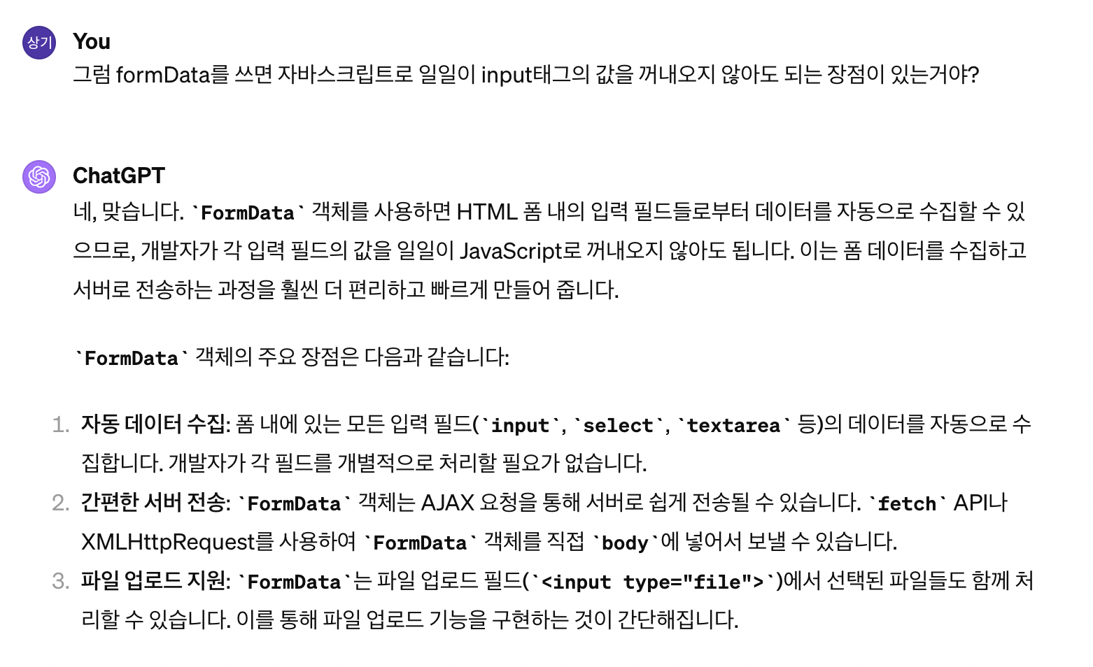 // FormData 객체를 사용하여 AJAX 요청