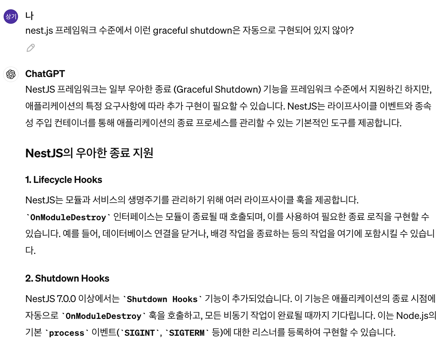 HTTP 서버 종료: NestJS가 사용하는 HTTP 서버 인스턴스를 종료합니다. 이 과정에서 모든 들어오는 요청이 처리 완료되거나 거절됩니다.