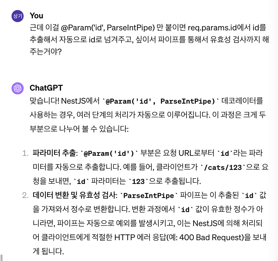 Nest는 메소드가 호출되기 전에 직전에 파이프를 삽입하고, 파이프는 메소드에 대한 인수를 수신하여 작동