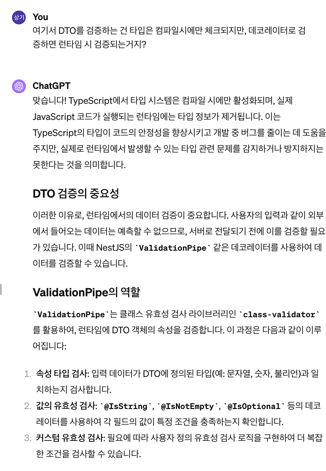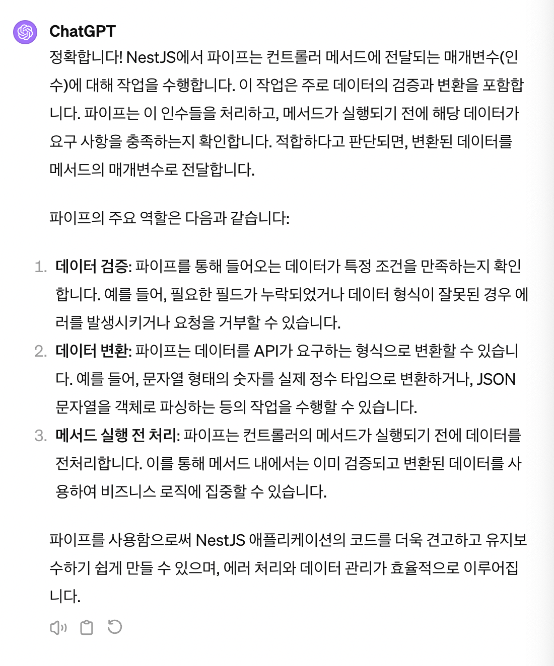 2. 유효성 검사: 입력 데이터를 평가해서 유효한 경우 전달, 유효하지 않으면 예외 발생