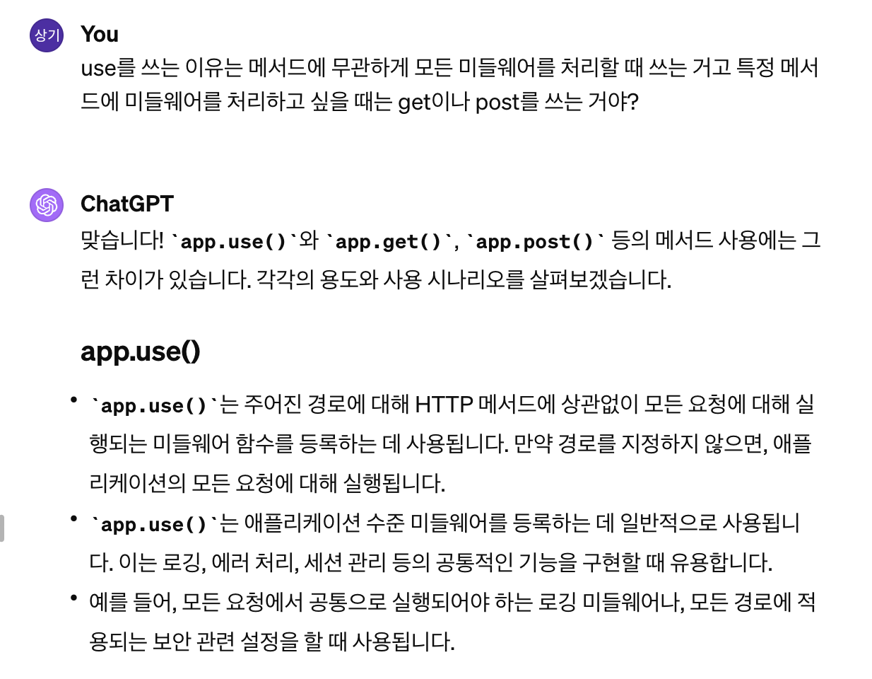 app.use(), app.get(), app.post() 등으로 미들웨어를 장착할 수 있다.