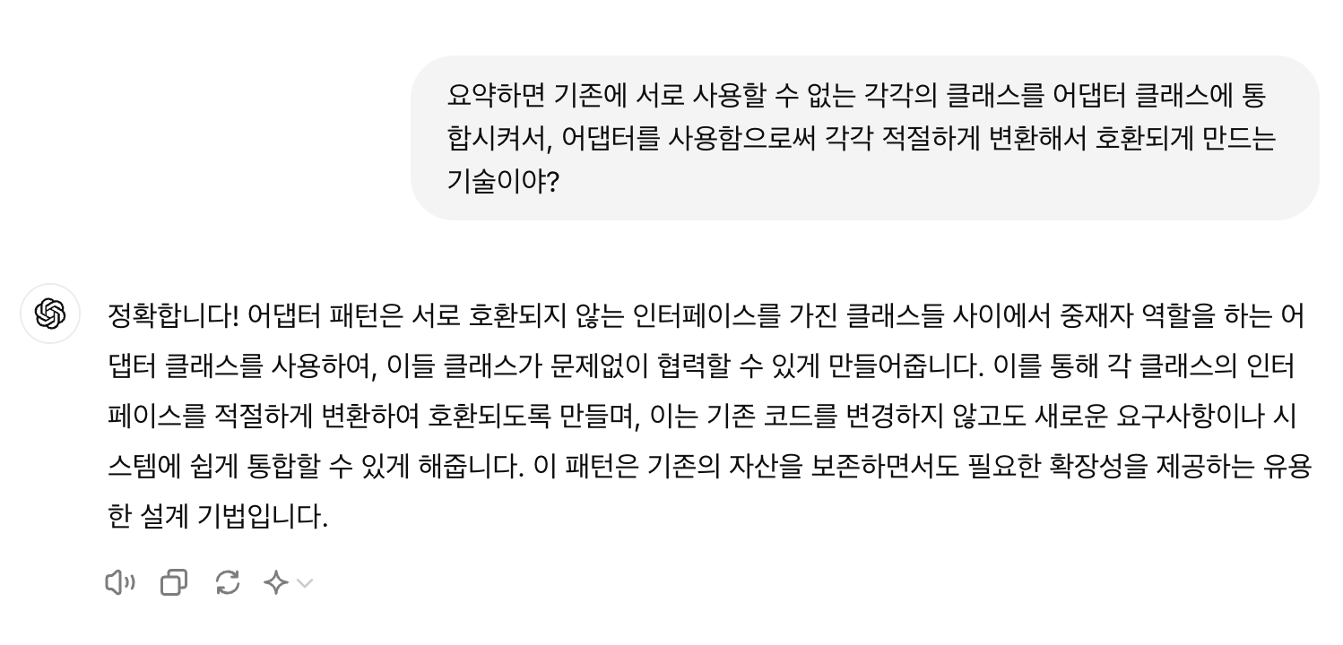 두 개의 호환되지 않는 인터페이스 간에 연결고리 역할을 하여 함께 작동할 수 있도록 돕는 패턴