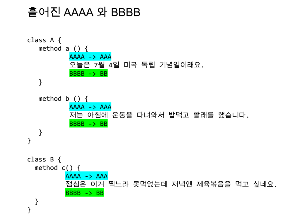 BBBB도 마찬가지로 BB로 변경해야하는 일이 생긴다면 BBBB가 쓰인 여러 메소드를 모두 찾아 BB로 변경해야한다.