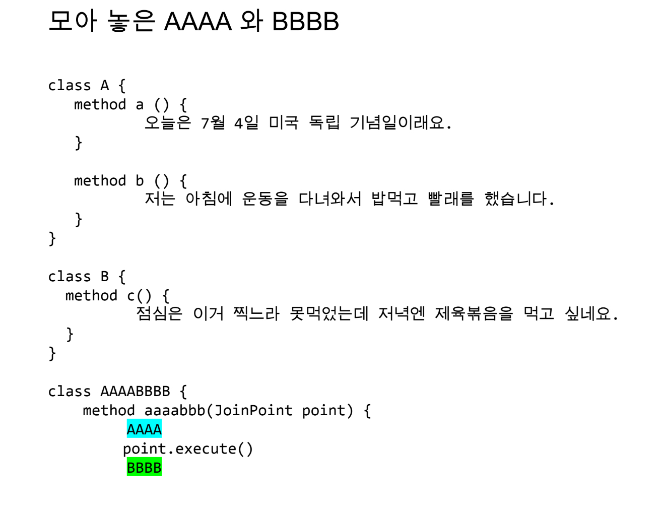 그리고 무엇보다도, 성능 측정과 같은 횡단 관심사 코드 부분에 수정 사항이 생겨도, class AAAABBB