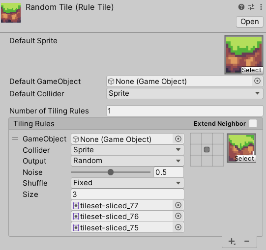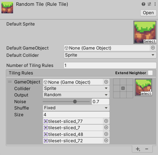 Rule Tile은 규칙에 따라 자동으로 타일을 배치해주는 기능으로,스프라이트의