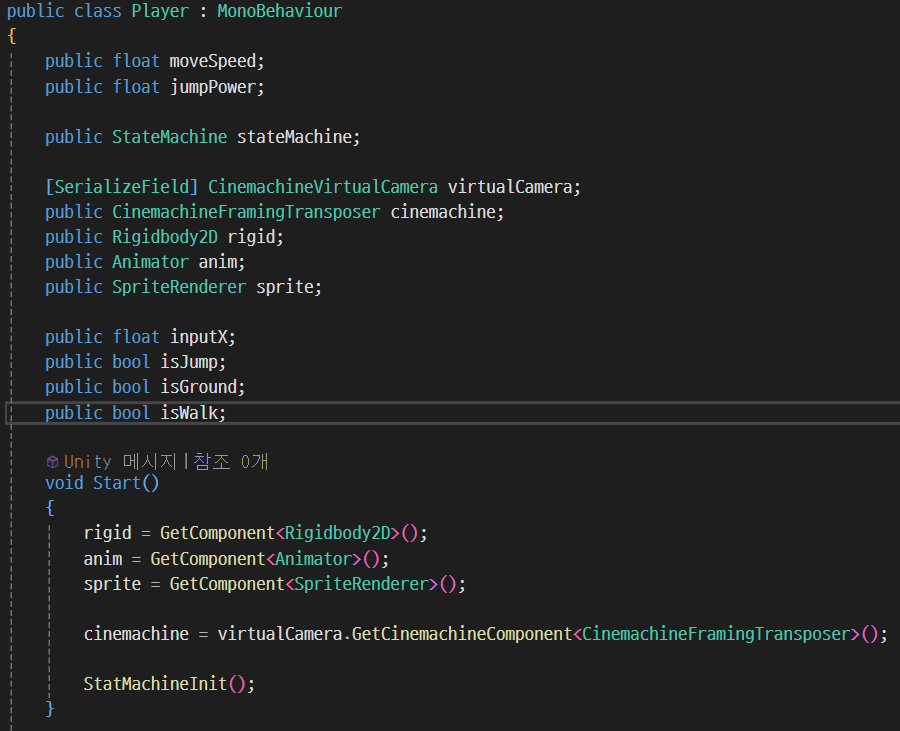 기존 코드는 필드변수, 입력, 이동 및 점프 로직, 애니메이션 전환 등