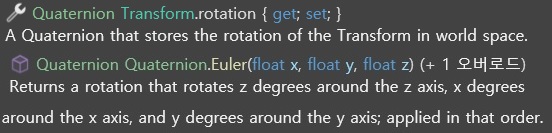 즉, transform.rotation에 회전값을 할당하는 방법이 필요하다.