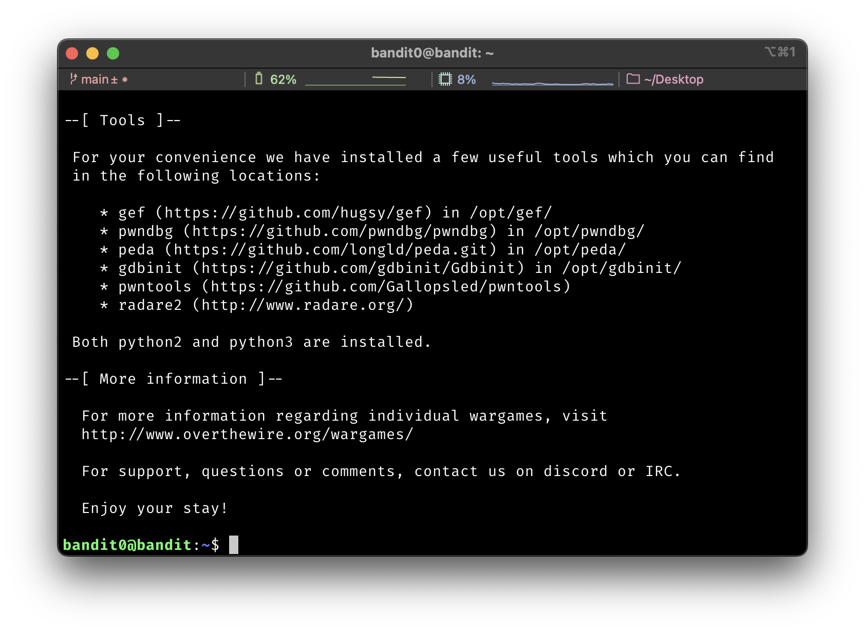 The goal of this level is for you to log into the game using SSH. The host to which you need to connect is bandit.labs.overthewire.org, on port 2220. The username is bandit0 and the password is bandit0. Once logged in, go to the Level 1 page to find out how to beat Level 1.