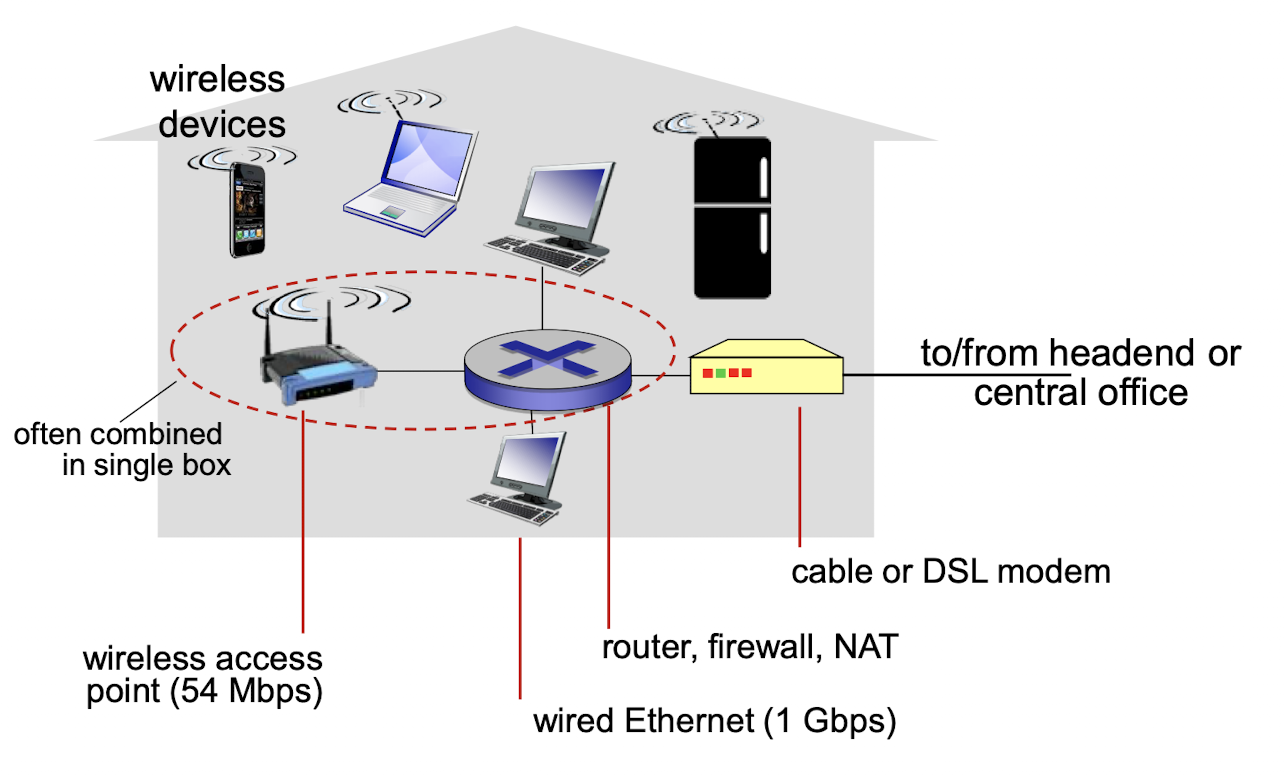 전형적인 홈 네트워크이다. 그림에서 wireless accss point는 주로 우리가 알고있는 공유기이며 여러 장치들이 이곳에 연결할 수 있다.