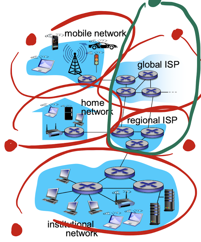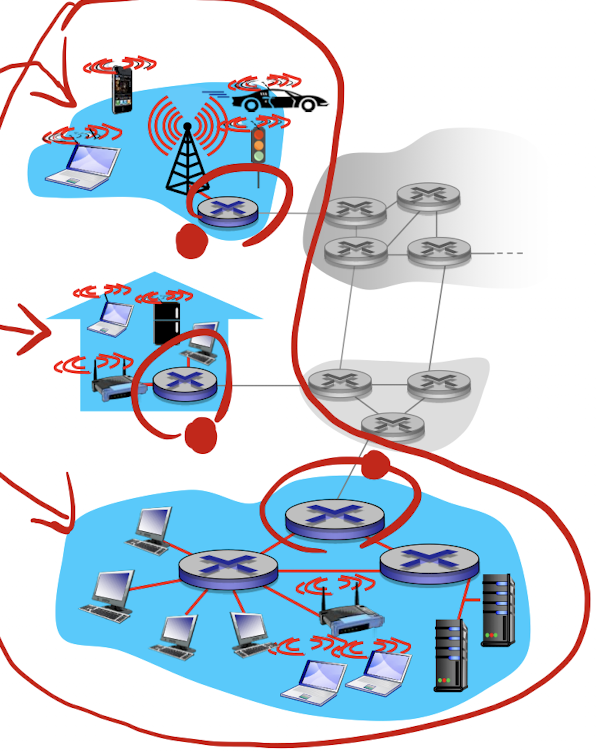 Access network 영역을 자세히 보면 end system들의 특성이 다른것을 확인할 수 있다. 무선으로 연결하는 노트북, 모바일 등과 같은 것들이 있는가 반면 집에서만 사용하는 기계들 그리고 대형 인프라가 구축되어 있는 네트워크 등과 같이 다양한 네트워크들이 access network들로 정의되고 있는 것을 확인할 수 있다.
