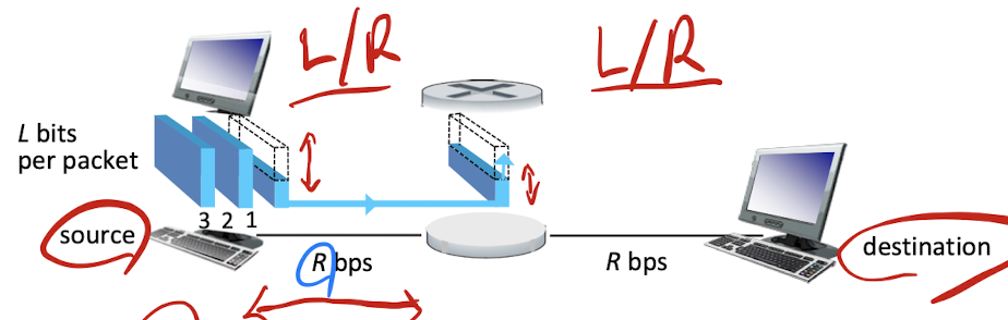 이라고 가정하면 다음 L bit의 packet이 link로 가기까지 걸리는 시간을 의미하는 pakcet trasmission delay 에 대한 식은 다음을 만족한다.
