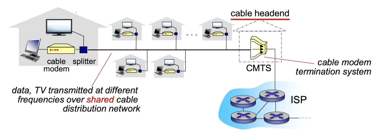 각 가정집에서 shared 회선을 사용한다. HFC(Hybrid fiber coax)라는 광동축 혼합망이다. 비디오, 데이터, 음성과 같은 광대역 컨텐츠를 운송하기 위한 네트워크에서 사용되며 서로 다른 부분에서 광섬유 케이블과 동축케이블을 사용하는 통신기술이다. 해당 네트워크의 사양은 다음과 같다.