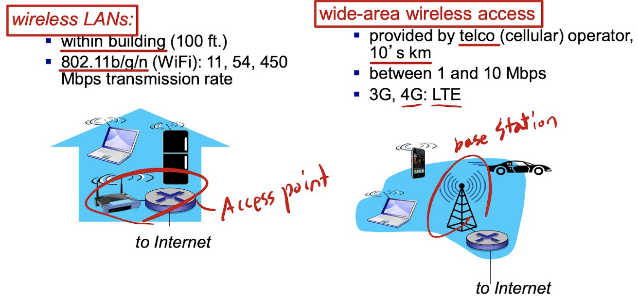end system들이 무선으로 네트워크를 공유하며 라우터로 연결되는 네트워크를 의미한다. base station 또는 access point라고 불리는 router와 연결된 지점이 존재한다. wireless LANs 와 wide-area wireless access가 존재한다. 각각의 특징은 위 그림과 같다.