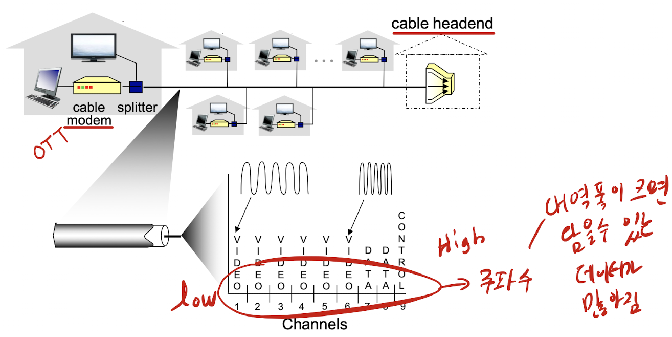앞서 설명한 DSL의 central office의 dedicated 회선을 쓰는점과 다르게 shared 회선을 사용한다.