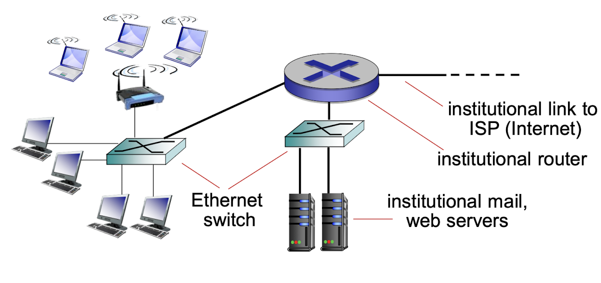 주로 회사와 학교에서 쓰이는 네트워크 구성이다. 10 Mbps, 100Mbps, 1Gbps, 10Gbps 등 다양한 transmission rates이 존재할 수 있다. 오늘날 많은 end systems들은 전형적으로 enterprice 급 네트워크의 Ethernet switch로 연결된다.