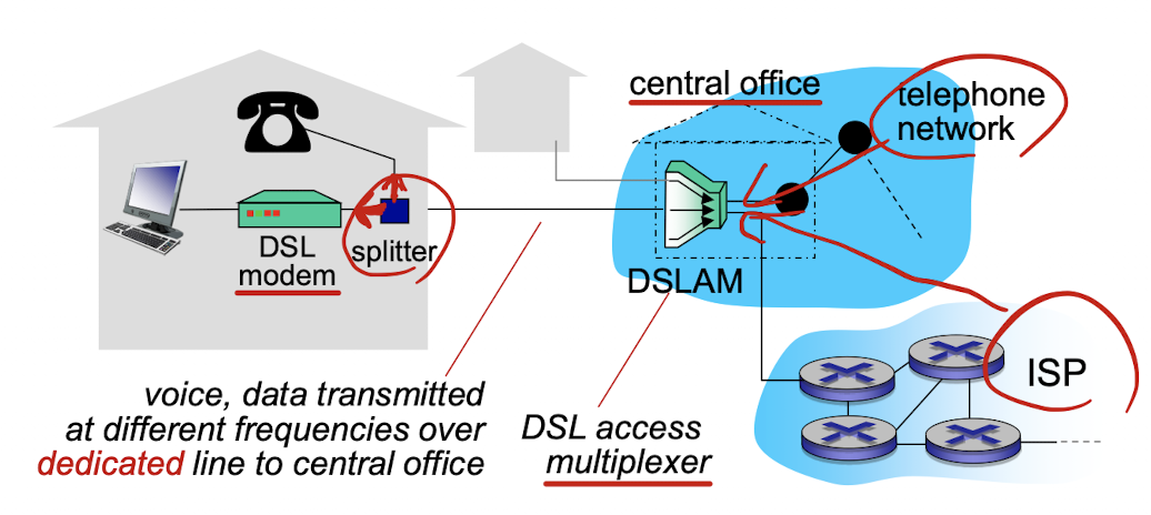 인터넷선이 보급되기전에 존재했던 dedicated 전화선을 사용하는 방식이다. 전화선이 모이는 central office의 DSLAM이 전화와 인터넷을 구분하여 telephone network와 ISP netwrok로 전달해주는 multiplexer 역할을 한다. 해당 네트워크의 속도 사양은 다음과 같다.