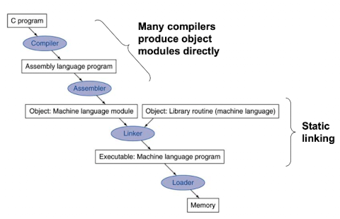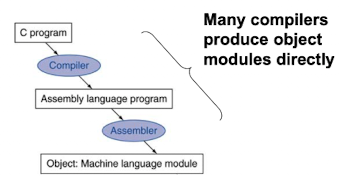 Compiler는 우리가 흔히 아는 C, Java 등과 같은 언어를 Translation 하여 Assembly language로 전환하고 Assembler가 이를 기계가 알아들을 수 있는 Machine languge로 전환한다.(Object 로 결과가 나온다)