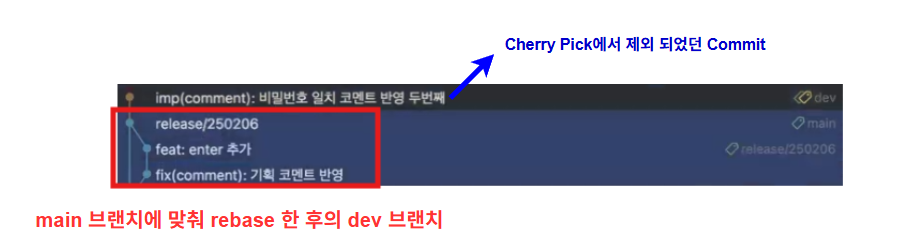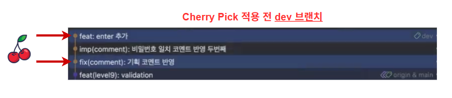 dev에서 특정 commit 내용을 빼고 main에 배포해야 할 때 사용한다. 즉, 특정 부분만 제외하고 Cherry Pick 해서 배포용 브랜치에 반영한다. (release 할 때)