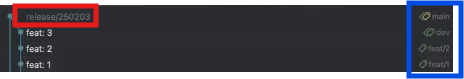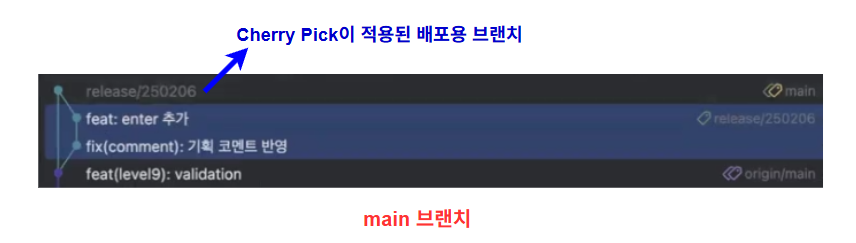 dev의 브랜치에서 위의 사진과 같이 Cherry Pick 하여 다른 브랜치(배포용 브랜치)에 적용하고 해당 배포용 브랜치를 main 브랜치에 merge하면 아래 사진과 같이 main 브랜치가 변경된다.