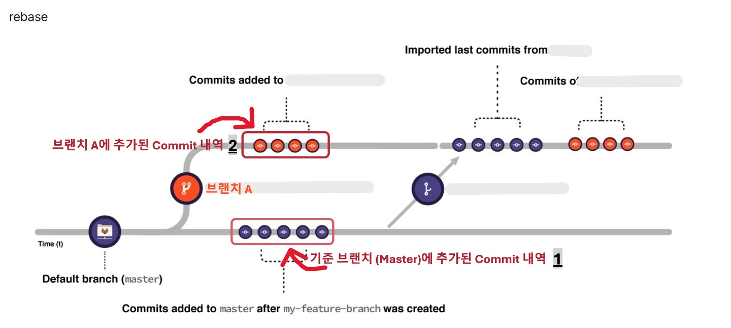 기준 브랜치(master)에서 브랜치 A가 분기된 후, 사진의 1번 과정과 같이 master에 새로운 커밋(변경 사항)이 추가된 후 Merge되면, 브랜치 A는 master의 최신 상태에 맞춰 커밋을 rebase해야 한다.