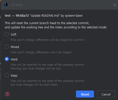 💡 Reset을 누르면 아래와 같은 창이 뜬다.