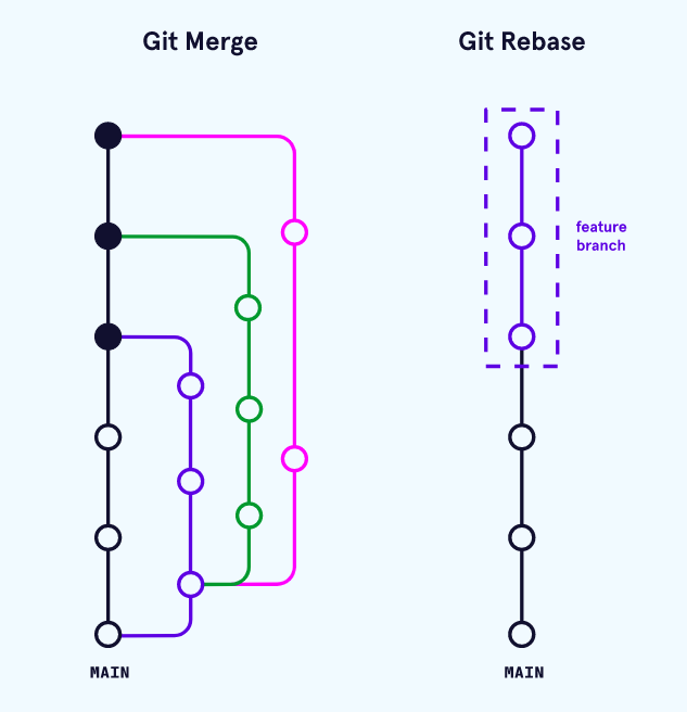 기준 브랜치는 새로운 Merge Commit을 만들어서 병합 작업을 진행하지만, Rebase는 기준 브랜치에 맞춰 재 정렬을 한다.