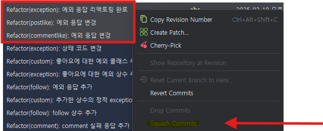 ➡︎ 합칠 Commit들을 선택한 후 Squash commit을 누르면 된다.