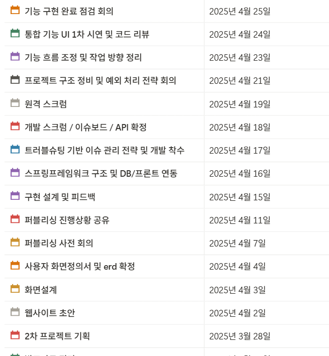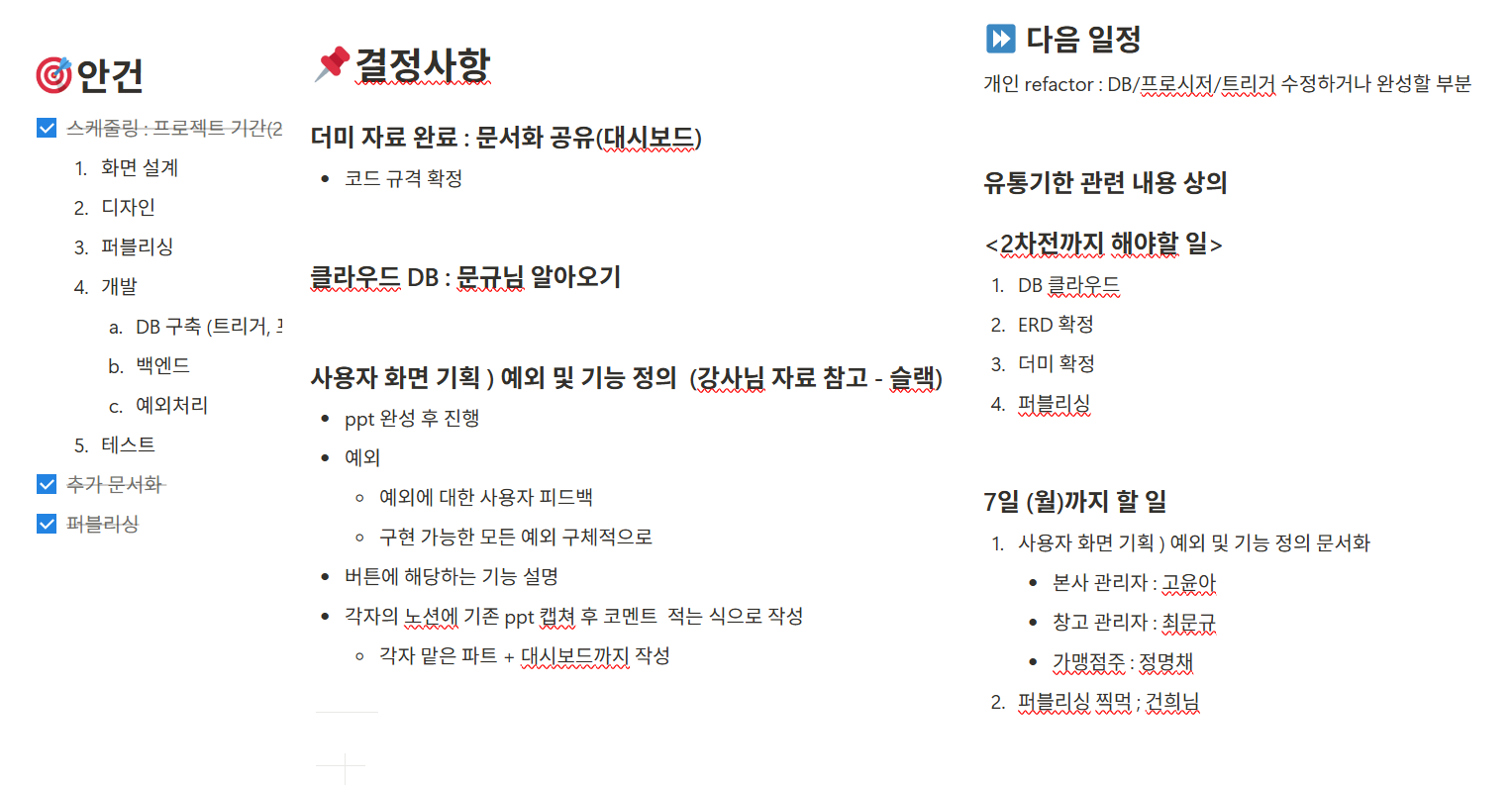 - 협업할 때 문서화가 얼마나 중요한지 이번 프로젝트를 통해 확실히 깨달았습니다. 처음에는 기억에만 의존해도 괜찮을 줄 알았지만, 프로젝트 후 2달 뒤 다시 모여 리팩토링을 하려다 보니 문서화되지 않은 부분은 거의 기억이 나지 않아 막막했습니다. 다행히 저희는 모든 과정을 실무 단계에 맞춰 산출물로 정리하고, 기능 흐름도, 테이블 정의서, API 명세 등을 단계별로 문서화해두었기 때문에 다시 코드를 처음부터 확인하지 않고도 빠르게 업무 흐름을 파악하고 리팩토링을 완성할 수 있었습니다. 이 경험을 통해 문서화가 협업과 유지보수에서 얼마나 중요한지 체감했고, 앞으로도 어떤 프로젝트든 반드시 실천해야겠다고 다짐했습니다.