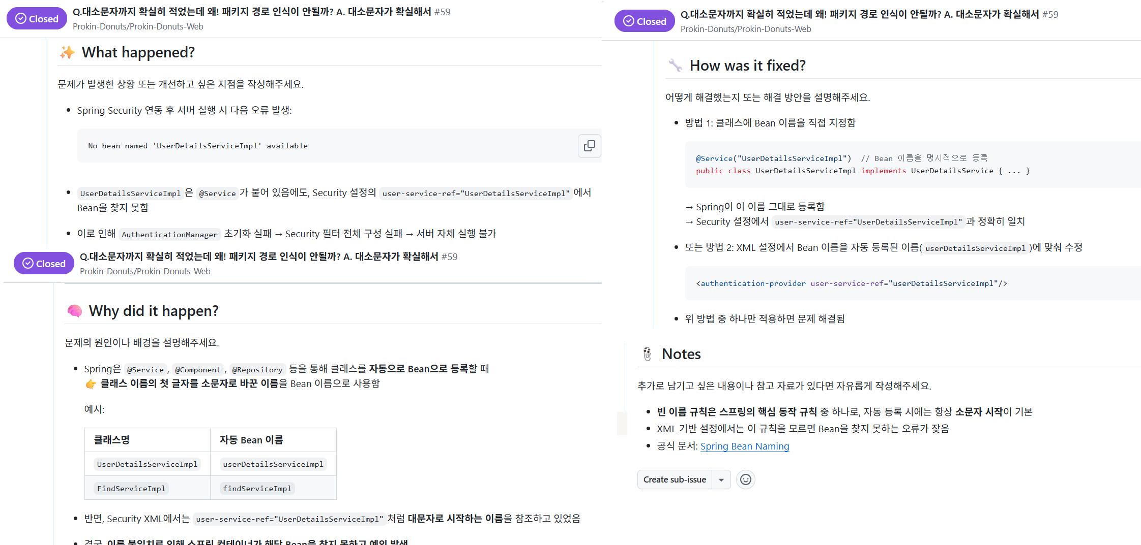 프로젝트 초반에는 발생한 문제를 구두나 개인 메모로만 공유해 팀원 간 동일한 이슈가 반복 발생하고, 해결 방법도 일일이 전달해야 하는 비효율이 있었습니다. 이를 개선하기 위해 GitHub 이슈를 도입해 발생 원인과 해결 과정을 기록하고 공유했습니다. 그 결과 누구나 이전 이슈와 해결책을 쉽게 찾아볼 수 있어 반복되는 문제를 빠르게 해결하고, 팀 전체의 문제 해결력과 협업 효율이 높아졌습니다.