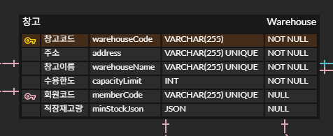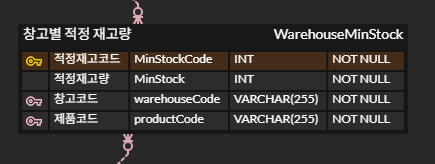 - (문규) -> 창고마다 각 제품의 적정재고량은 모두 다르기 때문에 창고별 적정 재고량 테이블을 만들자