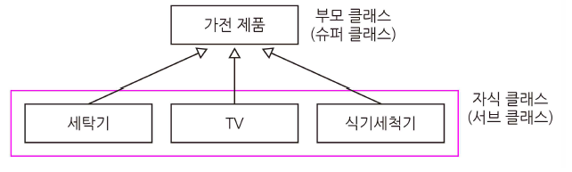 - 하위 클래스가 상위 클래스의 속성과 메서드를 상속하는 관계