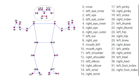 그 다음 실제로 각도를 계산해보자. 우선 아래 그림이 MediaPipe에서 제공하는 관절? 점? 정보이다. (33개)