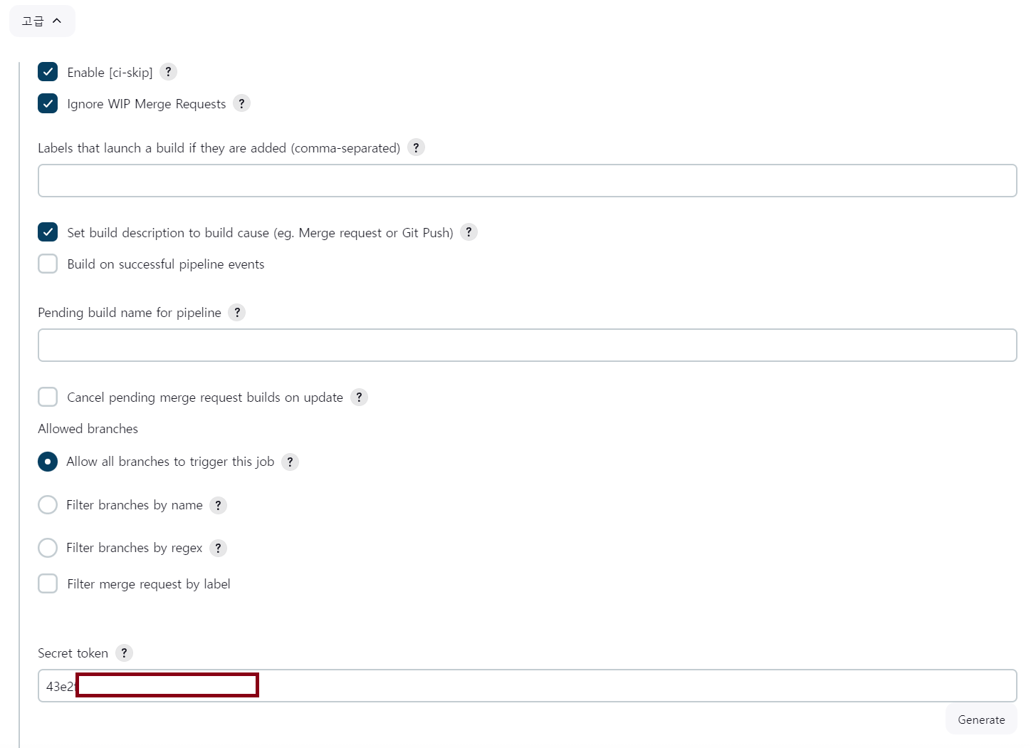 또한 아래 고급을 눌러서 secret token을 생성한 뒤 복사해두자.
