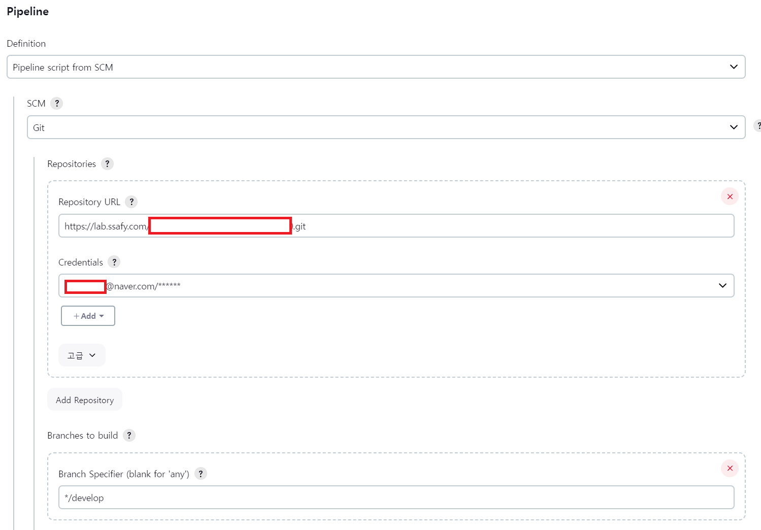젠킨스 메인페이지에서 New Item을 누르고, 이름은 임의로 써넣은 뒤 Freestyle을 선택한다. 이후 Configure에서 정보를 채워 넣고, Credential은 아까와 다르게 ID/PW 조합을 선택한다. (깃랩 접속 아이디/비번으로 생성). 만약 브랜치를 설정하고 싶다면 */develop처럼 따로 입력해주고,