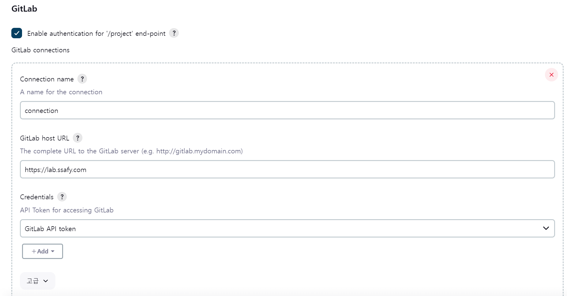 주의 Connection name은 맘대로지만, GitLab host URL에서는 레포지토리 주소를 다 쓰는게 아닌 앞에 host URL까지만 써야 한다.